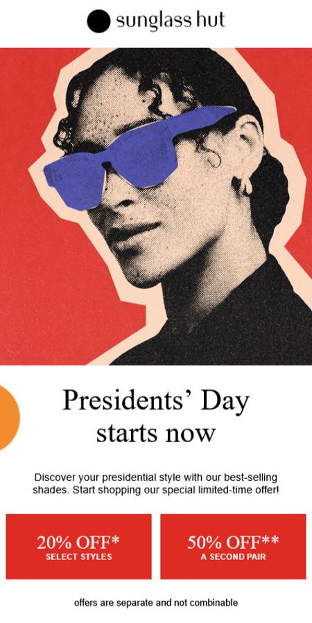 Presidents’ Day offers are here! Shop in store and get 20% off select styles or 50% off a second pair.
