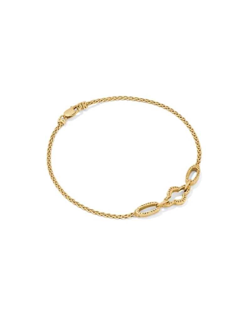 The Abbie Link and Chain Bracelet is a new take on two of our favorite icons. Featuring two open-frame Elisa shapes with an open-frame Abbie silhouette in the middle, this bracelet is crafted in long-lasting metal. With intricately etched details reminiscent of tooled leather saddles, this bracelet will be a favorite in any jewelry collection.