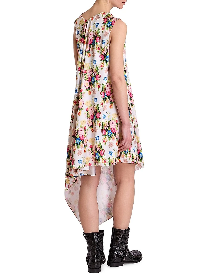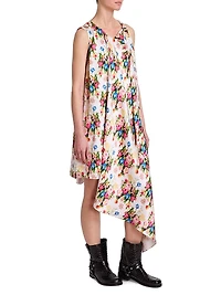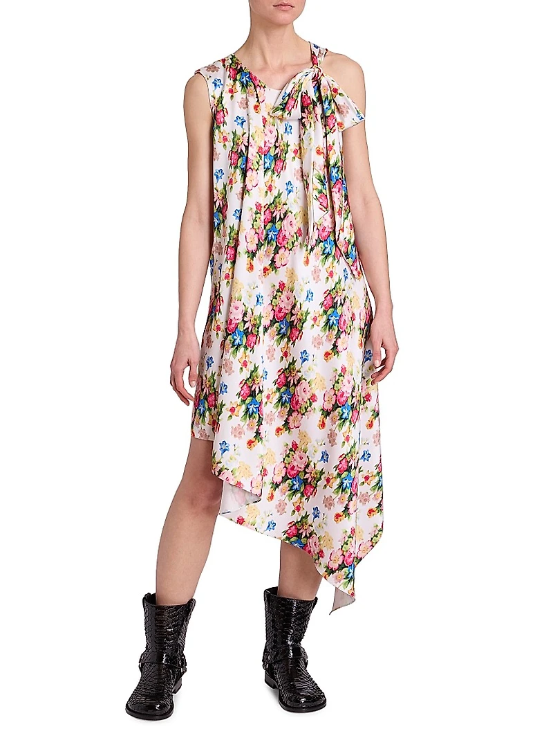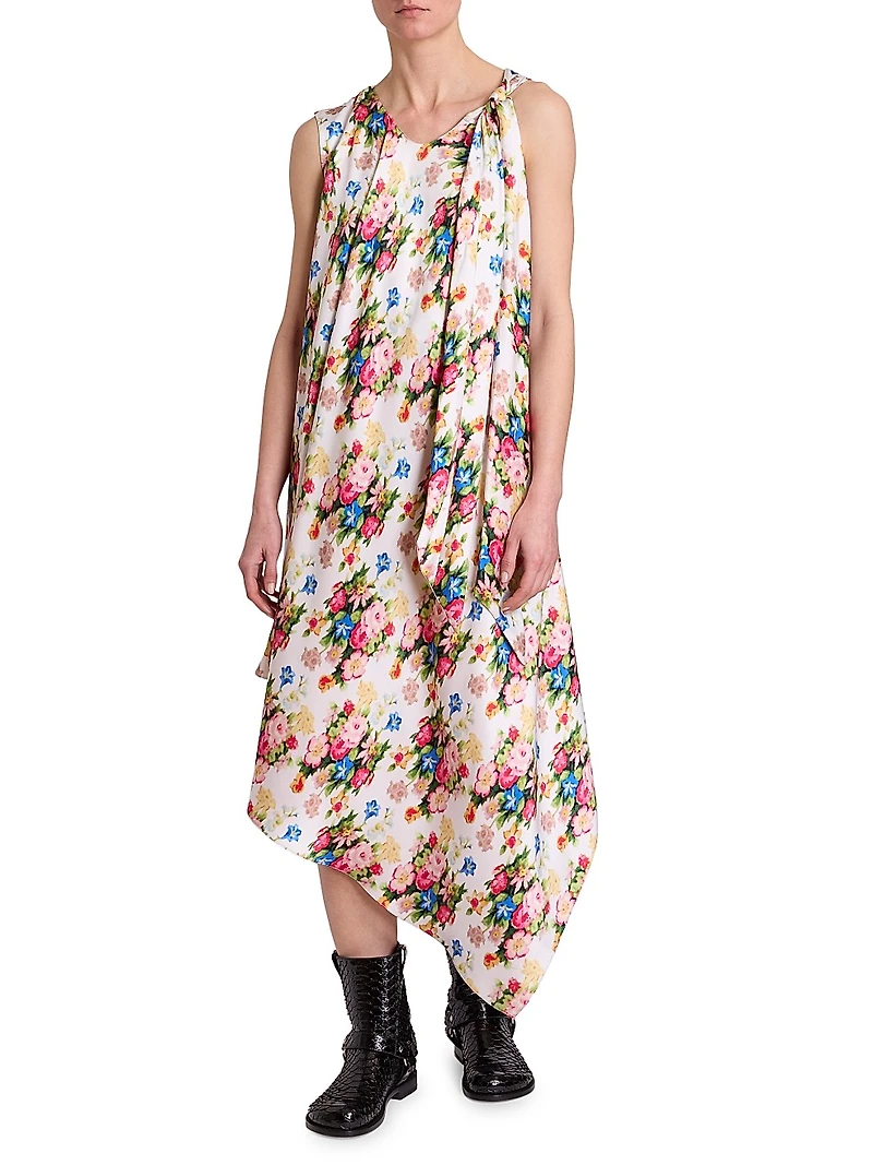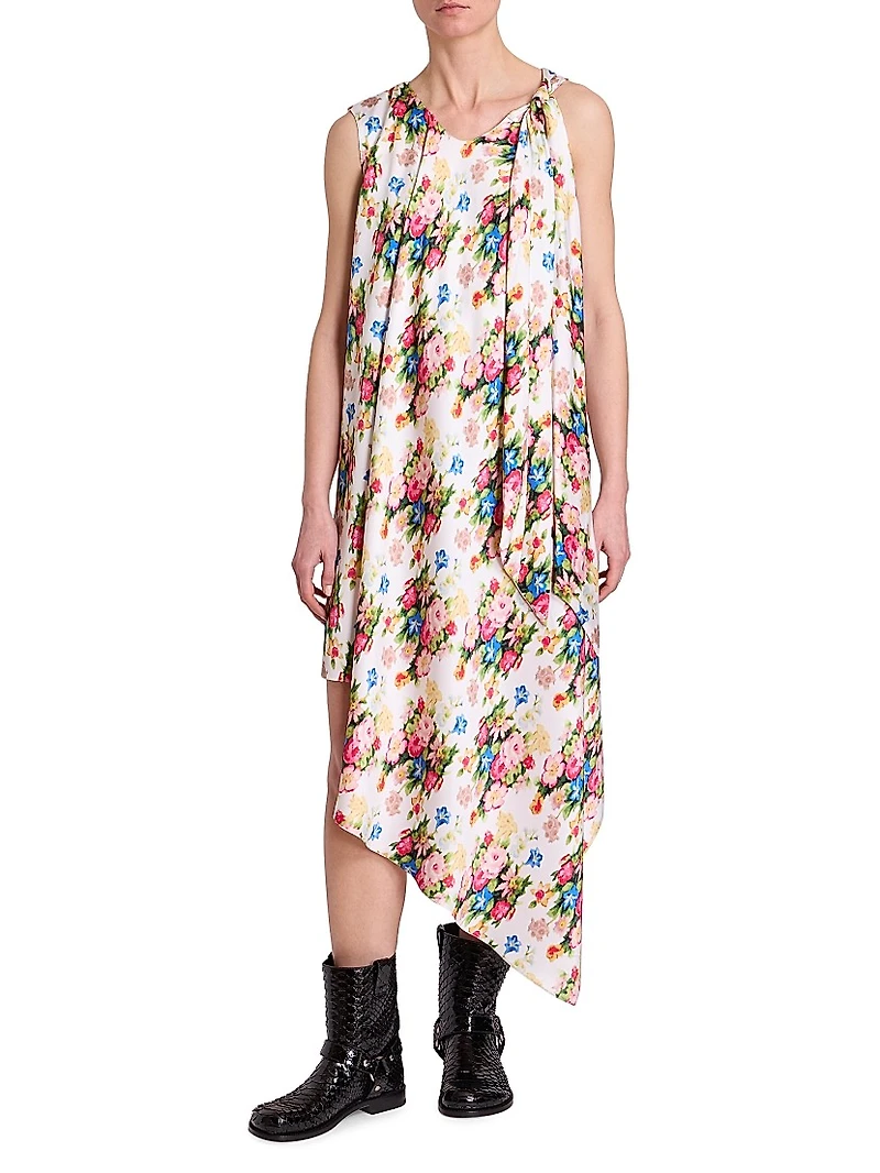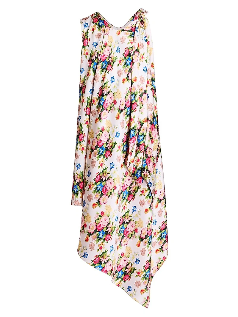 Crafted of Spanish silk, LOEWE's asymmetric floral midi-dress draped elegantly from the knotted shoulder.