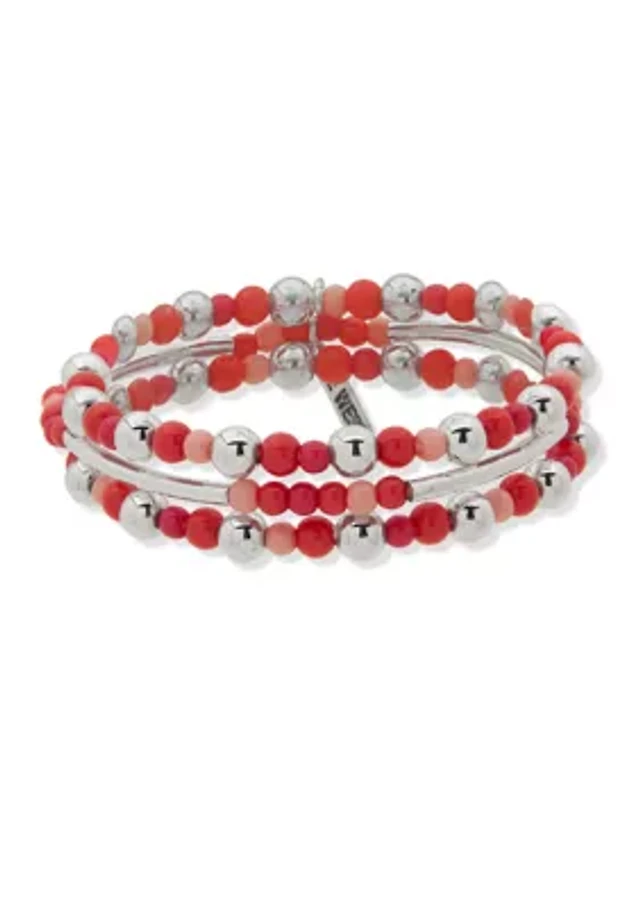 Gold-Tone 2 Row Coral Beaded Stretch Bracelet Set