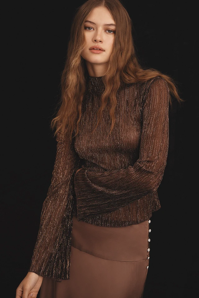 By Anthropologie Long-Sleeve Mock-Neck Metallic Top