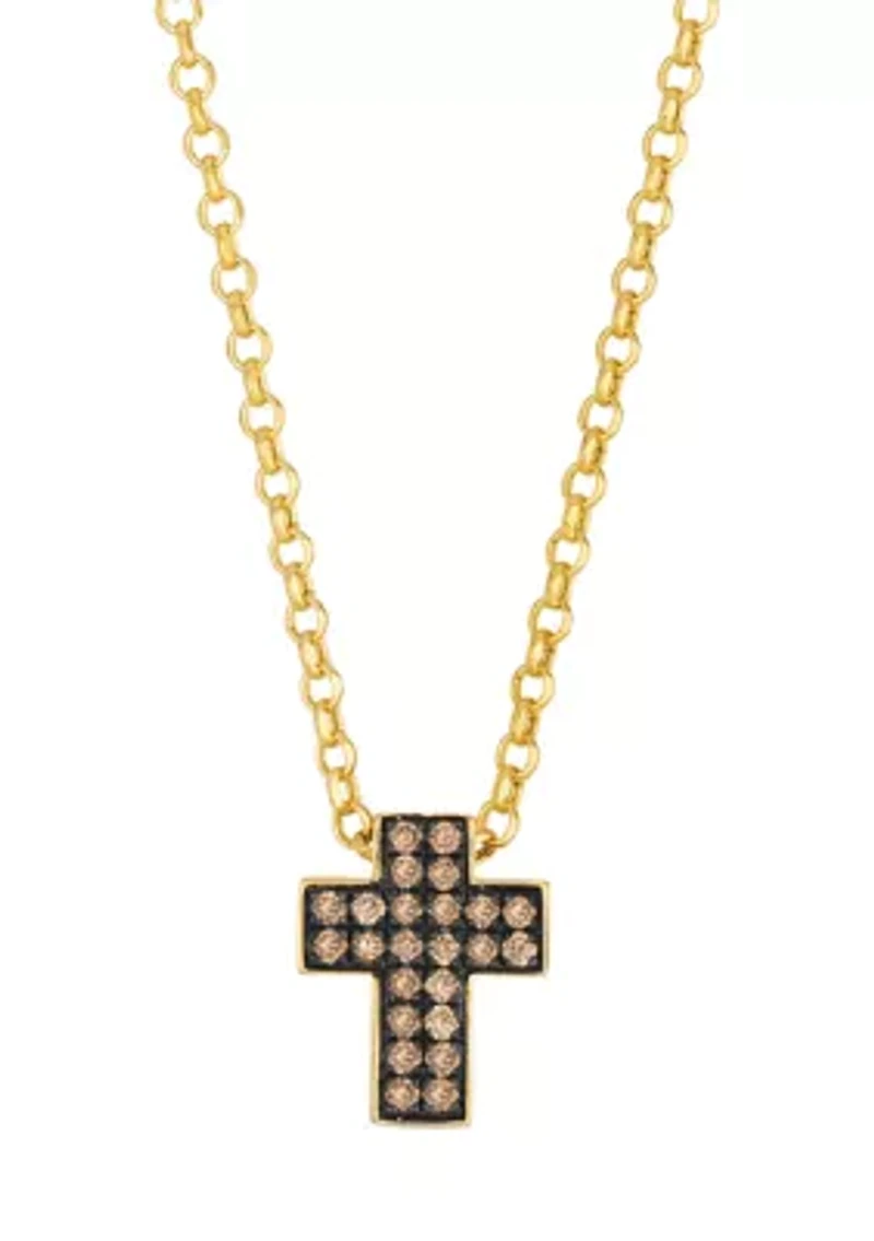 A symbol of faith and elegance, this necklace from Le Vian® features a delicate cross design, meticulously set with shimmering chocolate diamonds. The warm honey gold setting enhances the rich color of the diamonds, creating a captivating contrast. 24 Chocolate Diamonds® Lobster closure Polished finish Prong setting Warranty available Imported Product Specifications 19" L 1/8 ct. t.w. Chocolate Diamonds® Material & Care 14K Honey Gold™ Clean with a soft cloth