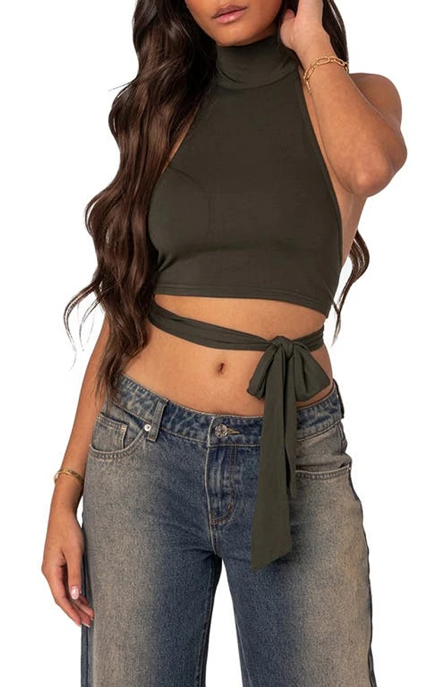 EDIKTED Hamlin Wrap Tie Halter Neck Crop Top Olive at Nordstrom,