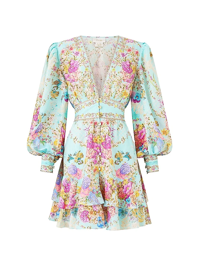 This Camilla minidress is crafted of a luxe linen blend and adorned with a vibrant floral print.