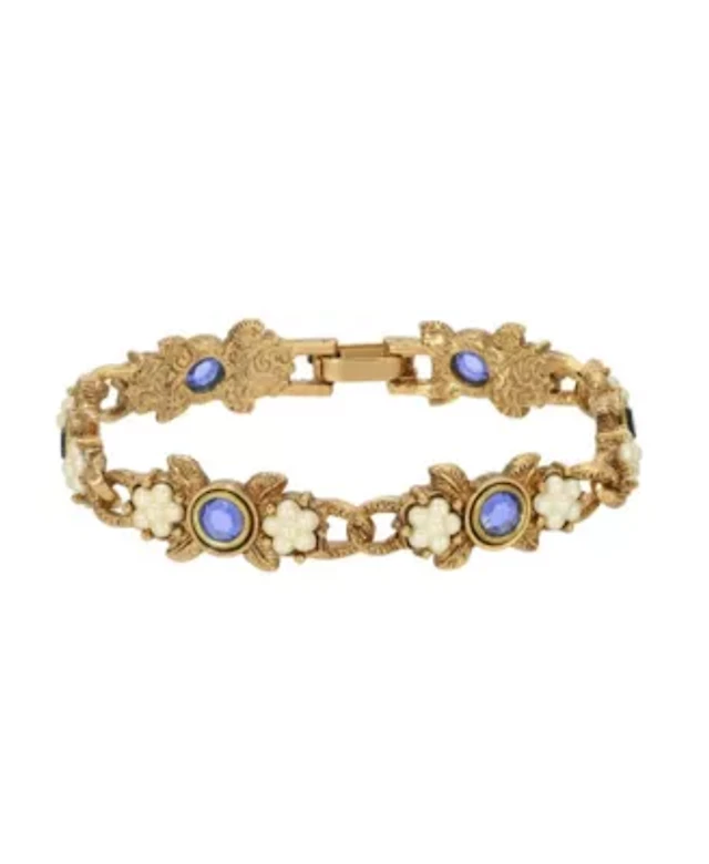 Gold Tone Faux Pearl Flower Blue Stone Bracelet