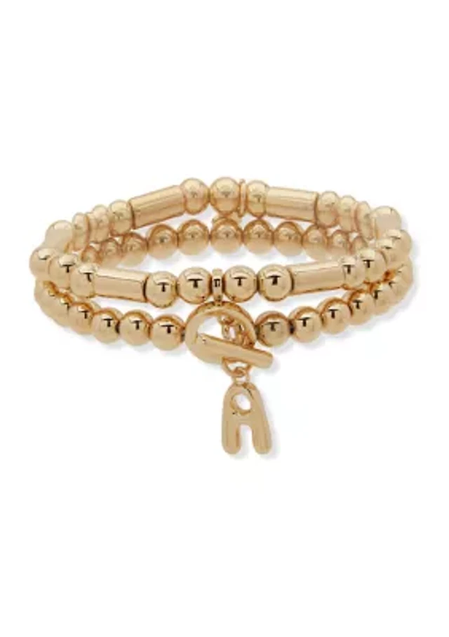 Gold Tone Puffy Initial Stretch Bracelet Set