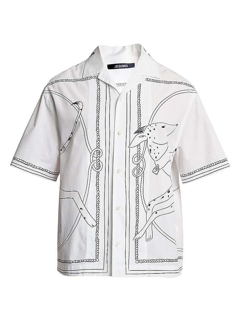 A playful dog sketch lends style to the Jean cotton poplin camp shirt from Jacquemus.