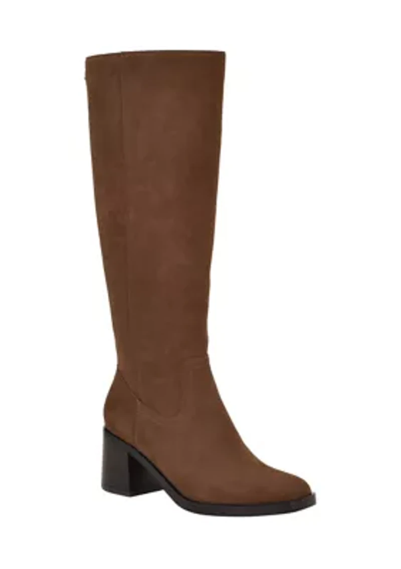 Elevate your wardrobe this season in the Tommy Hilfiger Laythen boot. This classic silhouette features a midheight stacked heel, inside zipper and subtle branded logo sure to complement any look. Est. 1985, Tommy Hilfiger is a leading lifestyle brand celebrating the essence of American style. -Material: Suede Zip closure Imported Product Specifications 2.17" heel 14.96" shaft height 14.3" calf circumference Medium width Material Faux suede