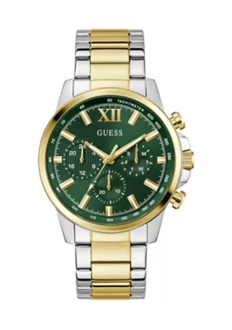 Sure to be a staple in your watch wardrobe, this clean dress look from GUESS® features a chrono-look multi-function dial and is paired with a sleek metal bracelet. Water resistant 50 M. Mineral crystal. Recycled stainless steel. Butterfly clasp Analog dial Multifunction Polished finish Date display 2-year limited liability warranty Imported Product Specifications 44 mm case size Material & Care Two-tone metal Clean with a soft cloth.