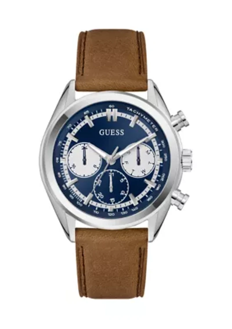 Elevate your style with this modern dress GUESS® timepiece that combines sophisticated elegance with practical functionality. Featuring an oversized 44 mm round case in silver tone polished recycled steel, paired with a brown smooth genuine leather strap. The blue sunray dial showcases a chrono-look multi-function movement. With 50-meter water resistance, this distinguished timepiece is perfect for the man who appreciates classic materials with contemporary functionality. Buckle closure Analog dial Multifunction Polished finish Date display 2-year limited liability warranty Imported Product Specifications 44 mm case size Material & Care Stainless steel Clean with a soft bristle brush and warm soapy water