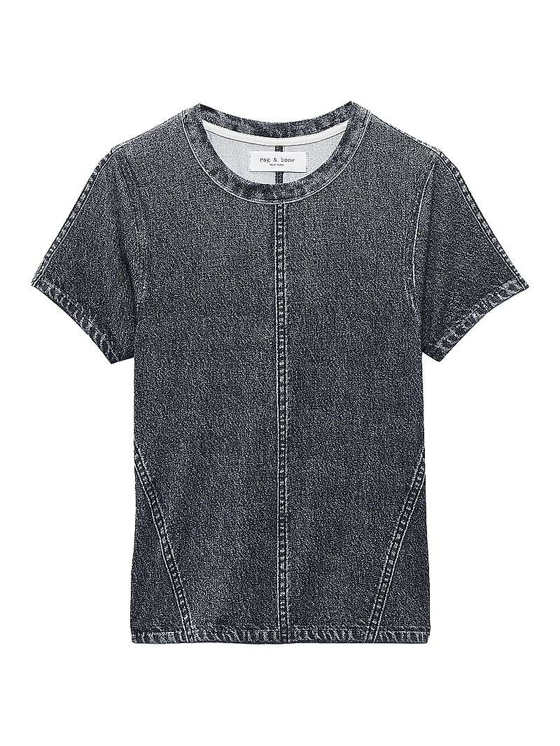 Miramar is rag & bone's hyperrealistic print designed to capture every intricate detail of classic jeans, from distressing and fading to tiny stitches and rivets. This revolutionary printing technique creates an optical illusion while retaining the original fabric's soft feel and function. This jersey baby T-shirt features a flat seam pattern.
