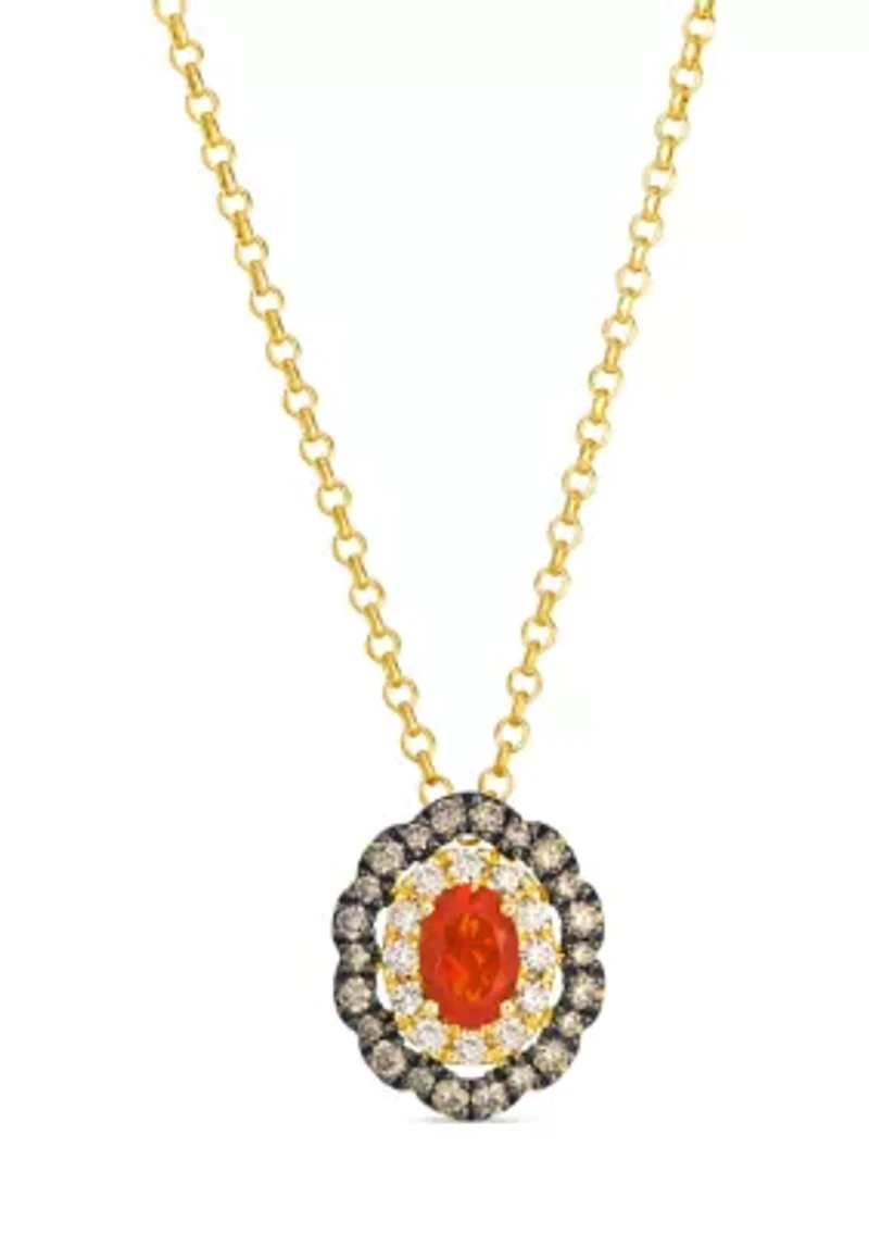 Add vibrant sparkle with this Le Vian® pendant, featuring 1/4 ct. t.w. Neon Tangerine Fire Opal® at its center. Accented with 1/4 ct. t.w. of rich Chocolate Diamonds® and 1/6 ct. t.w. of sparkling Nude Diamonds™, it’s set in warm 14K Honey Gold™. Perfect for gifting or elevating your everyday jewelry with a bold, colorful statement. 12 Nude Diamonds™, 22 Chocolate Diamonds®, 1 Neon Tangerine Fire Opal® Lobster closure Polished finish Prong setting Warranty available Imported Product Specifications 19" L 1/4 ct. t.w. Neon Tangerine Fire Opal®, 1/4 ct. t.w. Chocolate Diamonds®, 1/6 ct. t.w. Nude Diamonds™ Material & Care 14K Honey Gold™ Clean with a soft cloth