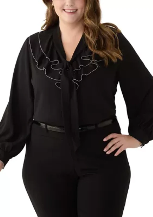 Long-Sleeve V-Neck Ruffle-Front Blouse
