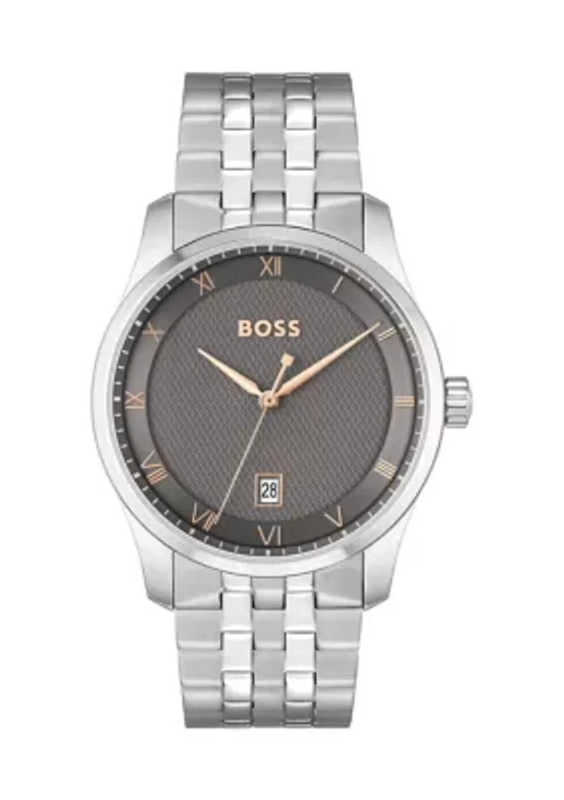 This men's watch combines classic Roman numerals with a modern textured dial for a refined look. The three-hand timepiece features a date function and domed mineral glass for a classic feel. The stamped pattern at the center of the dial is balanced by a circular brushed outer ring. With a stainless-steel case, it's fitted with a choice of bracelet or leather strap to complement various styles. Foldover clasp Analog dial Japanese quartz movement Brushed finish 2-year limited parts and labor warranty Imported Product Specifications 41 mm case size Material & Care Stainless steel Clean with a soft cloth