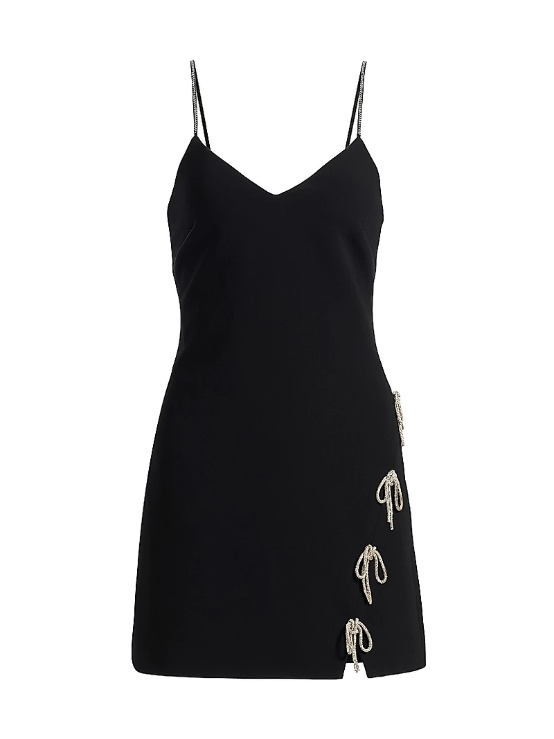 Cinq à Sept's sleek Rella minidress features adjustable spaghetti straps and a front vent adorned with rhinestones and corded bows.