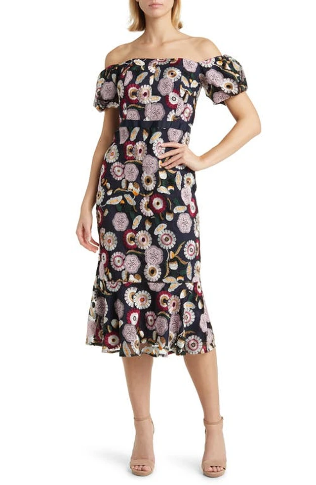Nira Floral Embroidered Off-the-Shoulder Midi-Dress