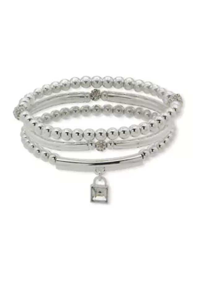 Silver Tone Crystal Padlock Stretch Bracelet Set