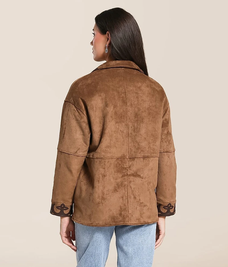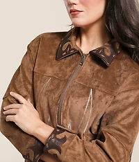 Metallic embroidered zip down lined jacket Faux leather trim Snap cuffs Bust measures 43" on size small Body length 27" on size small