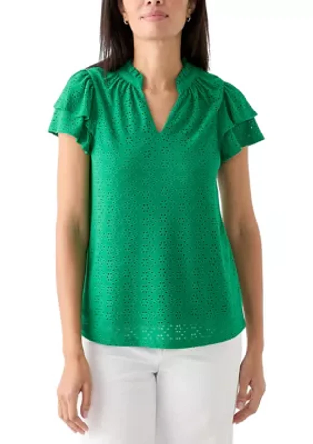 Women's Long Sleeve Raglan Split Neck Eyelet Blouse