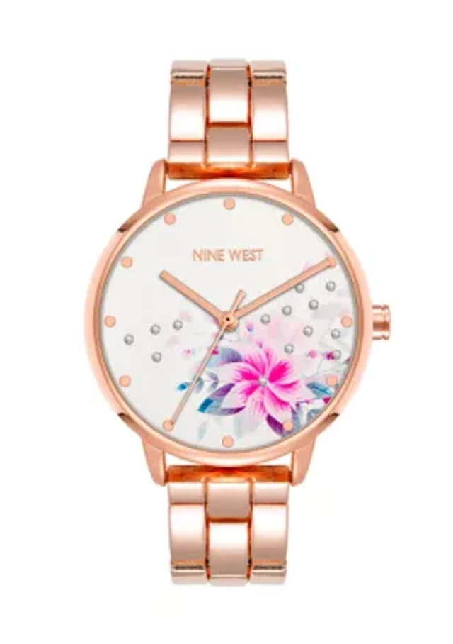 Women's Quartz Round Rose Gold-Tone Alloy Link Bracelet and Floral Pattern Watch